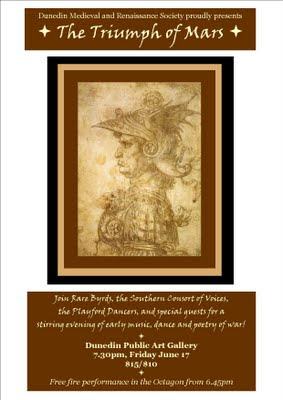 The Dunedin Medieval and Renaissance Society presents Rare Byrds, the Southern Consort of Voices, the Playford Dancers and special guests in 'The Triumph of Mars', a stirring evening of early music, dance and poetry relating to war and peace,